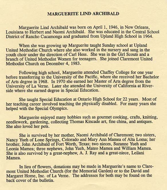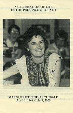 Rancho Cucamonga - Marguerite Lind Archibald, 54, of Rancho Cucamonga died Sunday, July 9, 2000, at home.